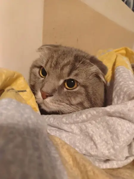 Ласковая, даётся на руки. Серая в светлую полоску. Глаза жёлто-зелёные, усы около носа чёрные у корня. На вид год, может, меньше. Ситниковская, д. 120.