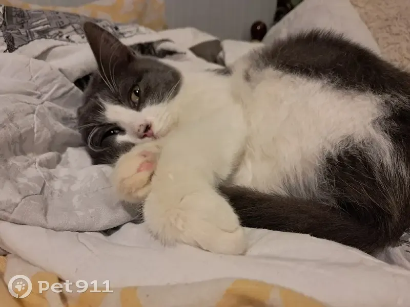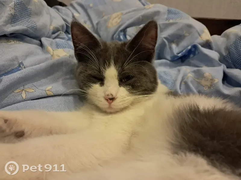 Найдена на лестничной клетке домашняя 3-4х месячная кошка. Окрас серая с белым, в жизни очень красивая. Прекрасно знает лоток, не грызет провода спокойная и оооочень ласковая