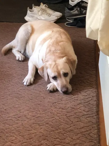Лабрадор-ретривер, светлый ,добрый, умный, знает команды , с людьми и котами ладит.