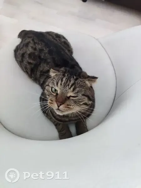 Вислоухий кот серо-зелёного окраса с чёрными полосами, грудка и живот рыжеватый, глаза серо-зелёные. Из особенностей - кастрирован, немного горбат. Домашний, пропал после того как выскочил на крышу 11го этажа и, скорее всего, с неё упал. Может быть сильно травмирован. Откликается на Соломон/Соломоша