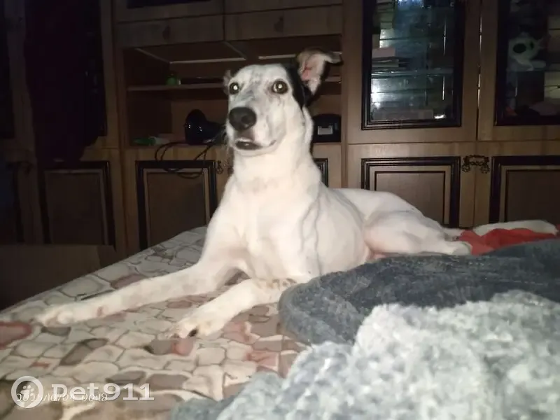 Белая собачка с чёрными пятнышками, правое чёрное ухо, оранжевый ошейник. Отзывается на кличку Стеша. Сорвалась с поводка у Прио банка и убежала в сторону площади театральной. Может гавкать от страха, но не кусается.