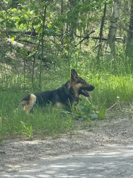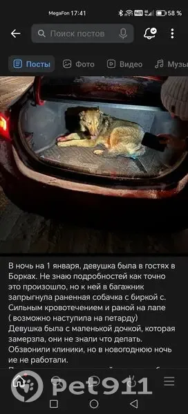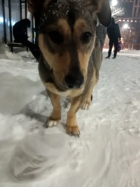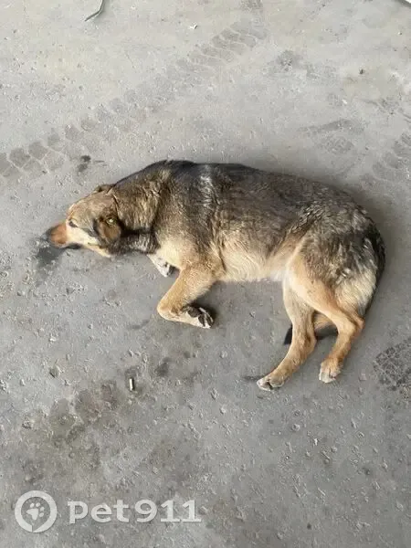 Собака крупная, но добрая и ласковая. На ухе зеленая бирка, под биркой болячка. Гоняется за машинами (дурная привычка). Откликается на кличку Найда. Может хромать на правую лапу - лапа ранена.