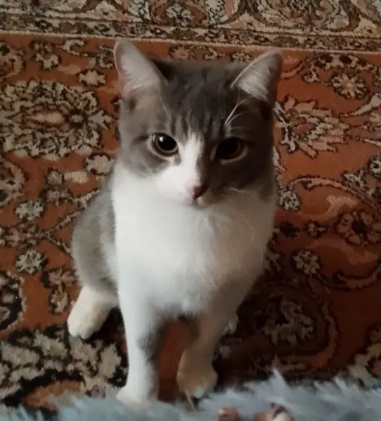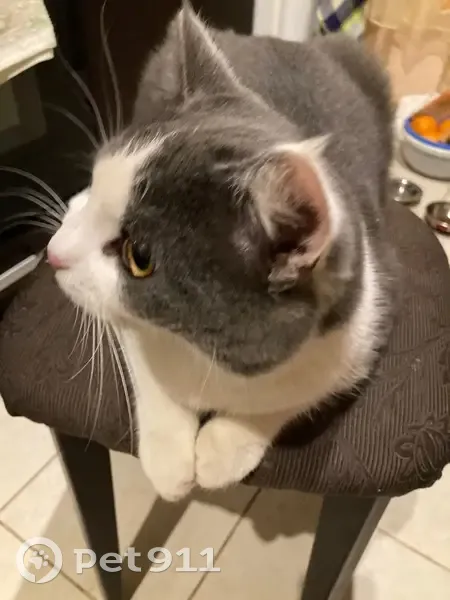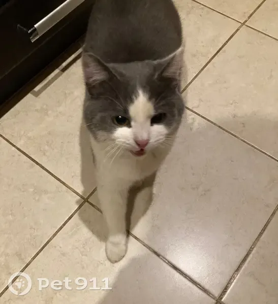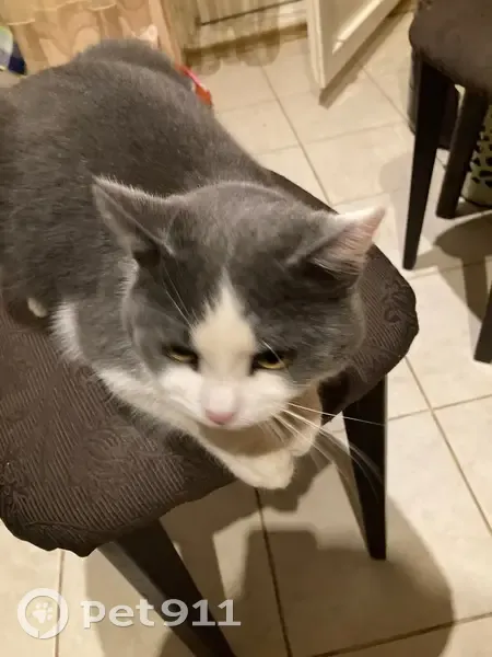 Найден на улице поздним вечером. Мяукал, сам подошёл. Чистый , хотя на улице грязновато. Окрас сероголубой, Белый ошейник, грудь и лапы. Молодой, крупненький.