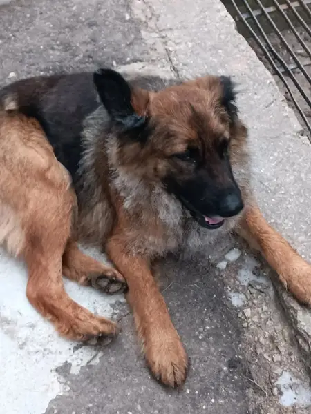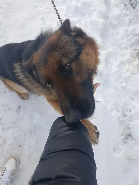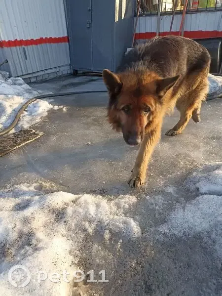 Рыже черный пес овчарка. Молодой Ласковый идет в руки, с ошейником Хозяин найдист