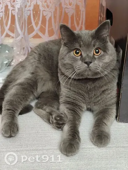 Порода - британец, возраст - 1 год, на шее ошейник фиолетового цвета, крупные глаза, не любит когда его гладят и берут на руки. Вышел из дома ( г.Рыльск, Курская обл., Боровское, уд.Зеленая, д.24) на территорию двора и не вернулся. За территорию домовладения никогда не выходил.