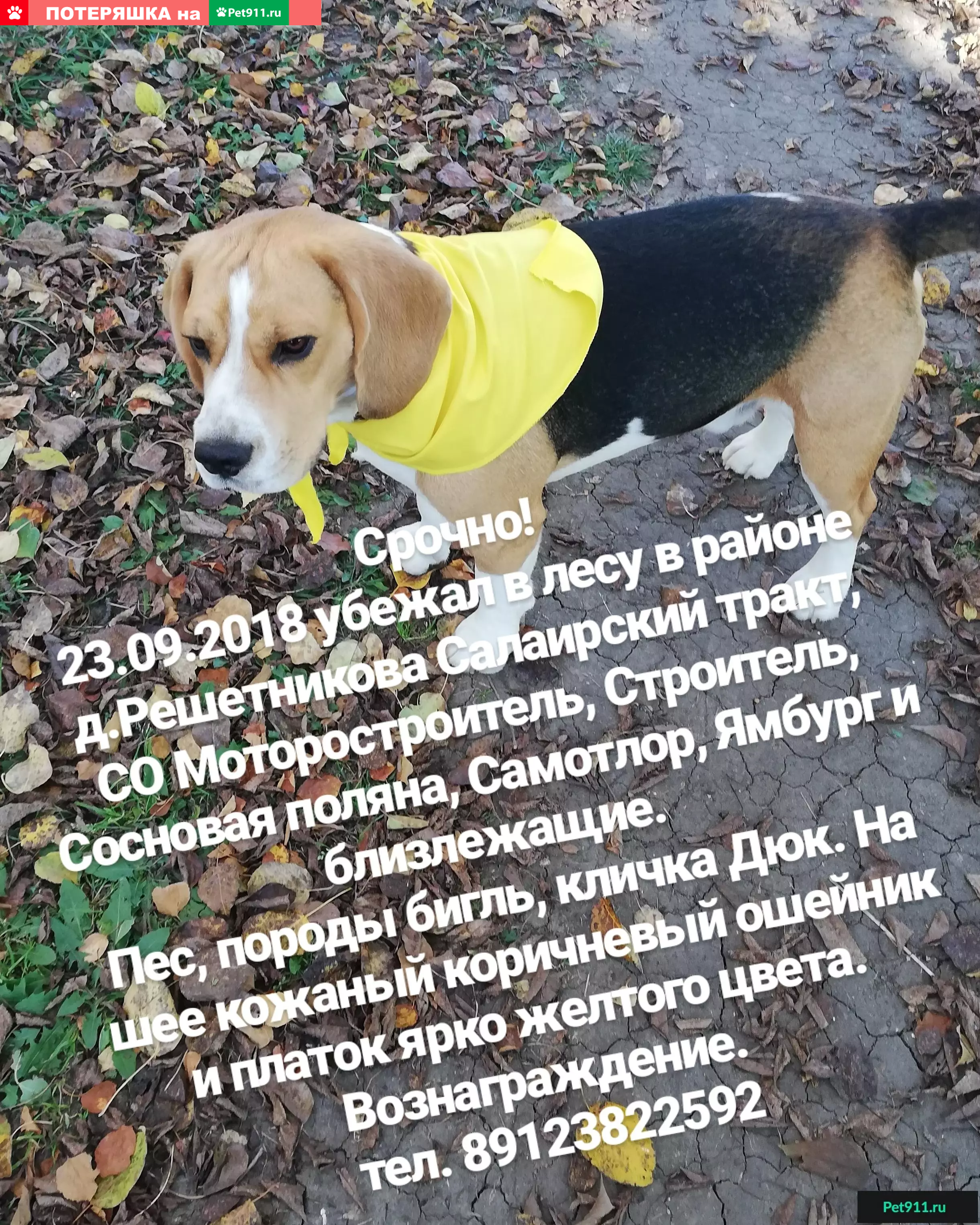 23.09.2018 убежал в лесу в районе д.Решетникова Салаирский тракт, СО Моторостроитель, Строитель, Сосновая поляна, Самотлор, Ямбург и близлежащие. Пес, породы бигль, кличка Дюк. На шее кожаный коричневый ошейник и платок ярко желтого цвета. Вознаграждение. Тел.: ,