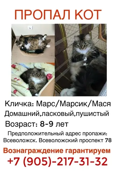 Красивая пушистая кошка, очень ласковая, умная, приучена к лотку. Возможно потерялась летом в р-не СНТ "Чайка", "Северная верфь" ж/д ст. Михайловская. Ищем хозяина.
