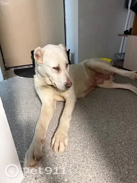 Похожа на алабая очень, она рожавшая видимо недавно, обвисшие красные соски и выделения кровавые видимо кто то выбросил ее на улицу после того как она родила.. Заходит в подъезды и в квартиру, ласковая и спокойная. Тянется к людям..