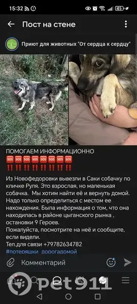 Здравствуйте, ищу собаку, девочка, кличка Руля, окрас серо - чёрный, пушистый хвост, может быть где угодно в пгт. Новофедоровка, крайний раз была во дворе по адресу ул., Севастопольская, 18