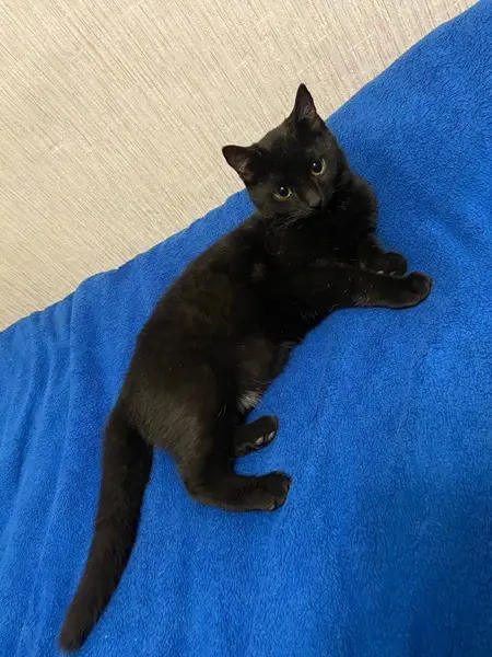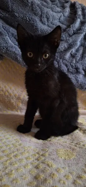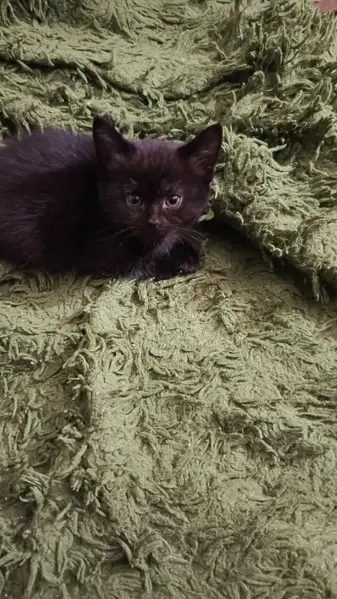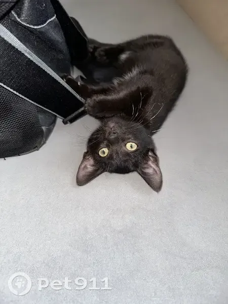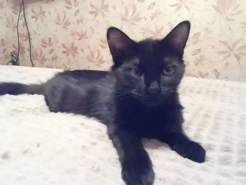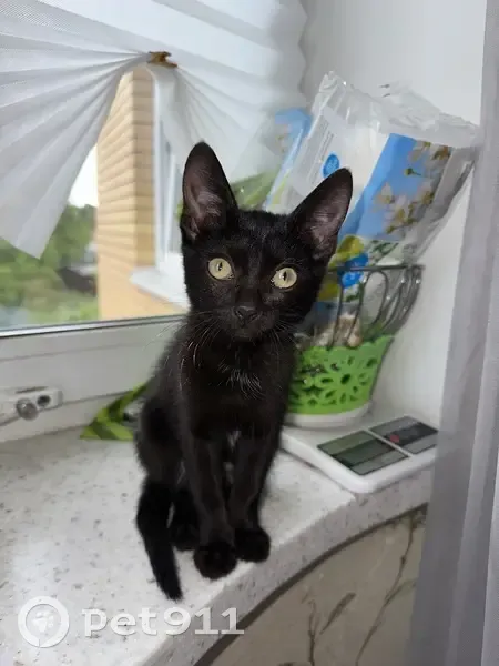 На остановке нашли Черную кошечку ( девочка) на вид месяца 3. На животике белое пятнышко. Ласковая, контактная, ест корм и обычную еду.