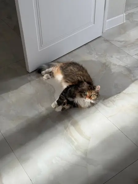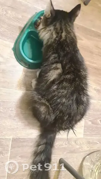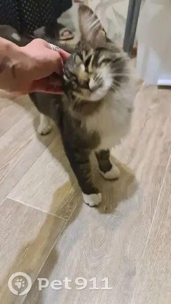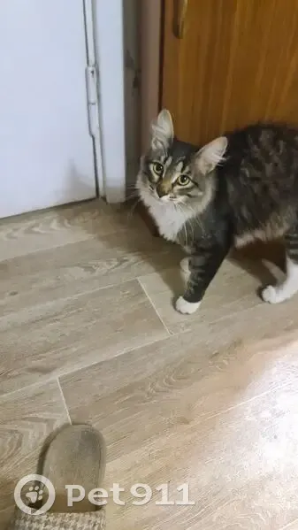 Окрас бело ,серый. На лапах как белые "ботиночки". Хвост длинный. Верхняя часть тёмная. Нижняя часть белая ,от подбородка до конца пуза. Вроде молодой, активный,ручной. Идёт гладиться, мурлыкает, играет с игрушкой