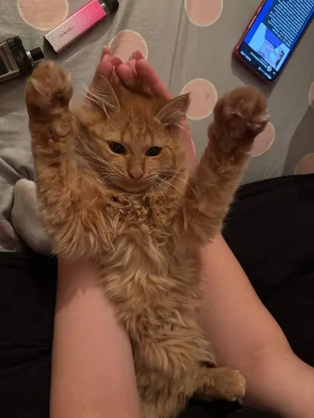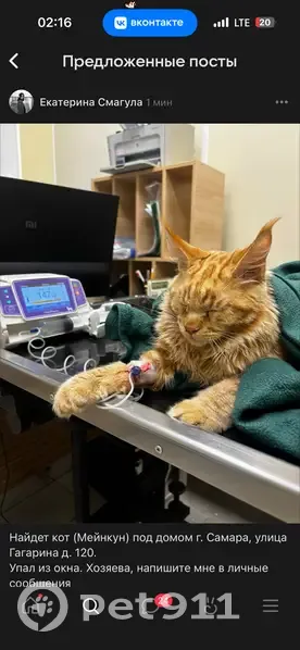 Кот лежал возле дома, весит 5,5 килограммов, рыжий цвет, молодой, порода мейнкун, в меру упитанный. На данный момент кот находится в стабильном состоянии под наблюдением