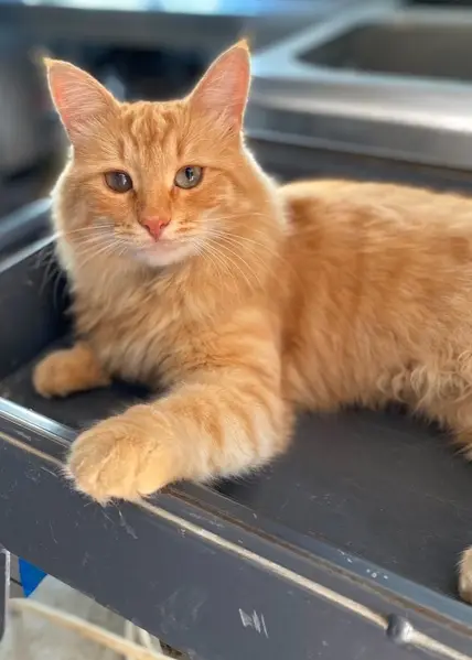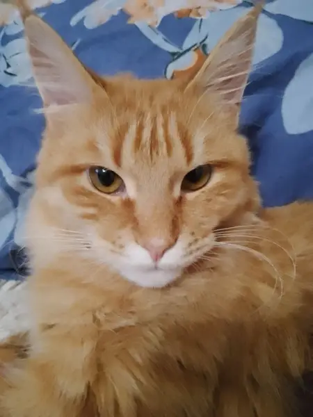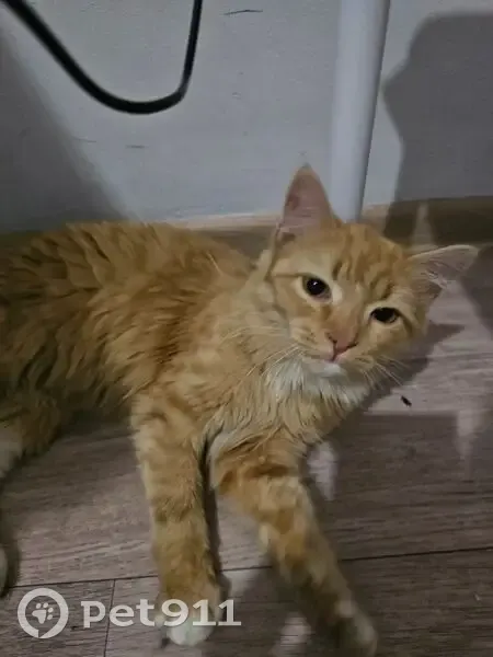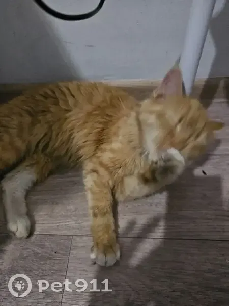 Кошка очень ласковая, рышая, худая, оранжевые глаза, пестрый и пушистый хвост, ноги и руки беленькие немного
