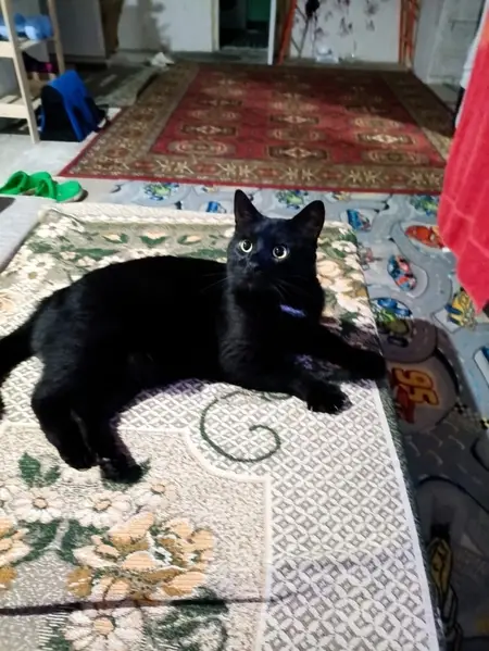 Район ТЦ Колизей. Кошечка. Цвет черный и белая грудка - галстук. Видно, что домашняя. Лоток на отлично. Игривая, ещё котенок. Ищет старых или новых хозяев!