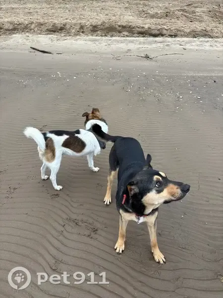 Красноглинский пляж «золотая рыбка». Гуляют две собаки, на обоих есть ошейники, ухоженные, похожи на домашних. Людей не боятся, идут на контакт У черной собаки на ухе бирка с номером 3453. Может убежали у кого.
