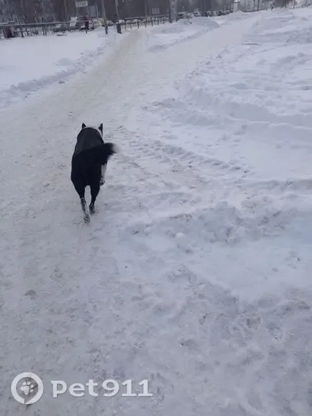 Чёрно-белый окрас. Один глаз голубой, другой карий. В ошейнике и металлическом наморднике. В руки не даётся. Судя по наледи на наморднике бегает несколько часов.