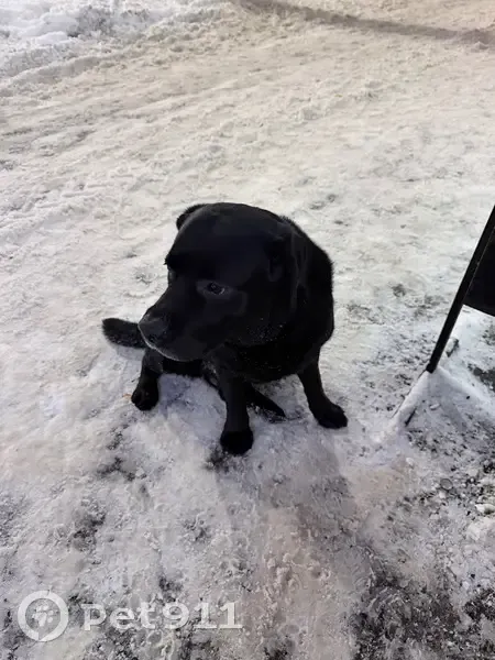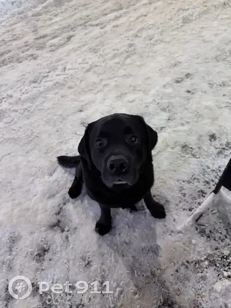 Похож на лабрадора (или метиса). Окрас — чёрный. Активный, очень дружелюбный. · Важно! Собака явно домашняя: на шее след от ошейника (примята шерсть), знает базовые команды «сидеть» и «дай лапу»