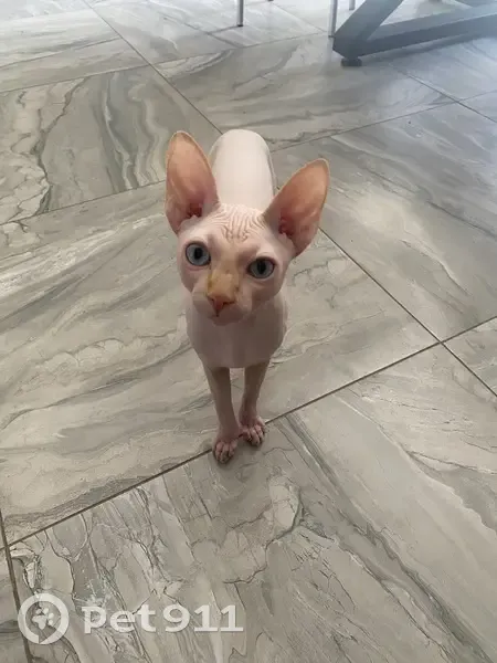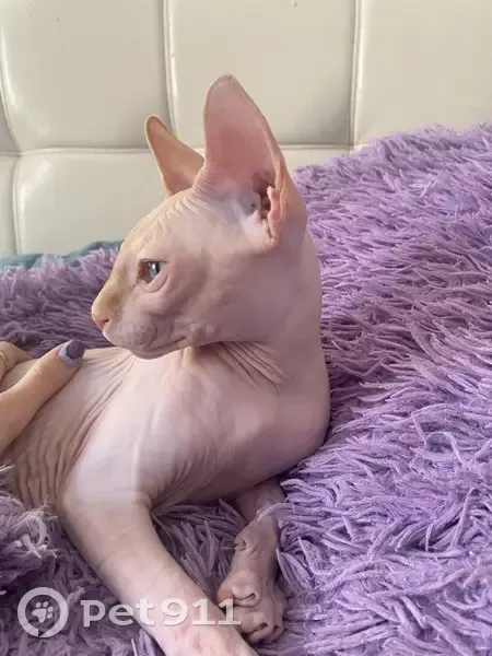 Сфинкс мальчик, зовут Лео, едва заметные волосики только на носике, носик рыжий, окрас розовый, отдает рыженьким. Любопытный. Гулял возле дома. Очень волнуемся