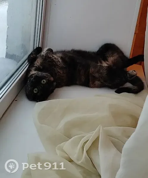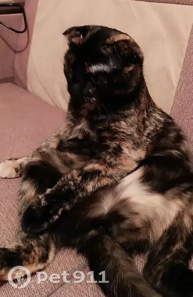 Черепаховый окрас, шотландская вислоухшка, 2.5 года, стерилизована. Пугливая, не контактная, когда боится шипит и злится, кроме меня ей никто не нужен. Хорошо откликается на имя, Мася, Масюня, девочка моя. Меня положили в больницу, 06.05. Где то через 10 дней она или сама выпрыгнула в окно или сосед помог.