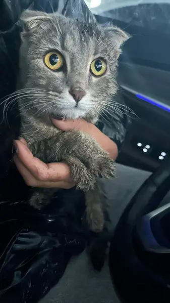 Вислоухий кот, кастрированный , на нем ошейник желтого цвета с колокольчиком