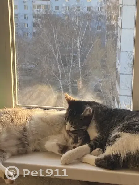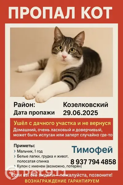 Белый животик, спинка полосатая и с пятнами (фото). Он очень добрый и ласковый, худой, очень гибкий. Очень любопытный. Пропал на даче, убежал. Район: Козелковский. У него на шее ошейник с кулоном, там его имя «Тимофей» и сзади адрес дома