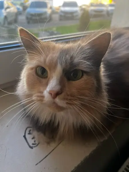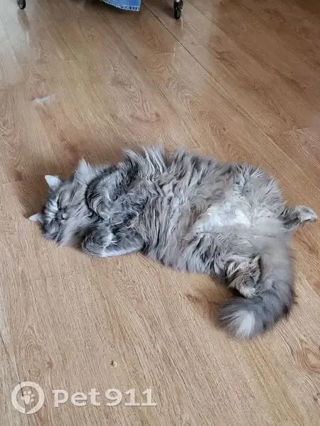 Очень пушистая, полностью серая, но морда - белая. Отзывается на кличку "Бужа". Максимально ручная, позволяет брать себя на руки кому угодно.