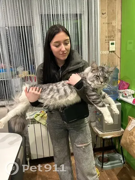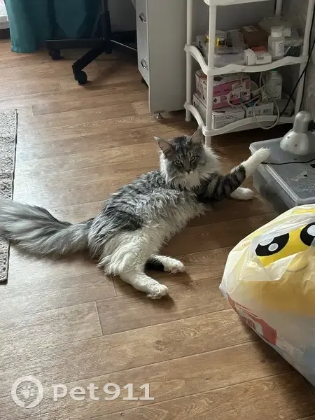 Мейн-Кун серо-белого окраса,на подушечках лап есть черные пятнышки. Крупный! Ласковый,но пугливый.