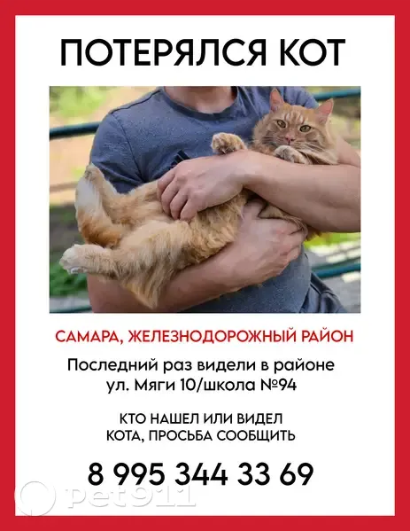 Кот, взрослый, достаточно крупный, длинношерстный, рыжий, глаза желто-зеленые Последний раз видели в районе ул. Мяги 10/Школы №94