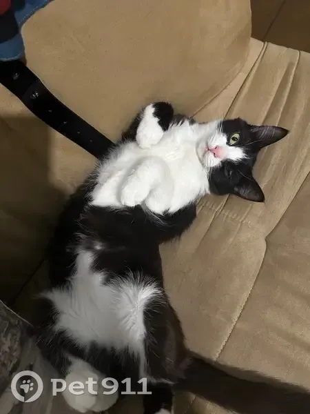 Молодой кот черного - белого окраса, спинка и хвост черные, лапки, мордочка и живот белые. Выскочил из переноски , когда выходили из ветклиники Айболит, побежал на территорию санатория Самарский.