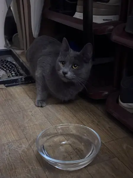 Кот домашний, не гуляет. Цвет шерсти серый, глаза жёлтые; кастрирован. Подобрали котёнком дворянин))))