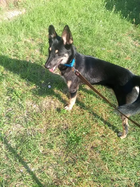 Убежал от салюта, спина черная, ростом как корги, порода дворняжка, глаза карие, хвост колечком, пугливый, по внешности похож на овчарку, лапы пятнистые в бежевый горошек, уши большие как у овчарки, брюшко белое, нос черный