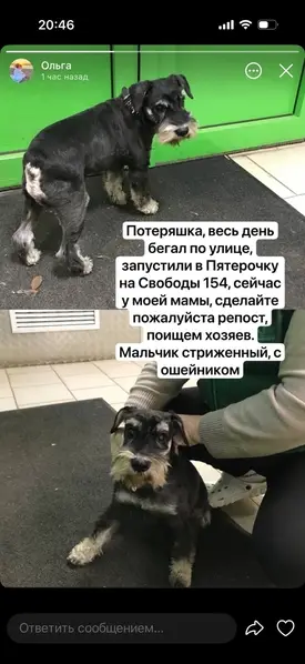 В районе Карла Маркса - Ново-Вокзальная - Шоколадная фабрика 31 декабря примерно в 18.00 потерялась собака, серый миттельшнауцер, девочка, зовут Вия, не агрессивная. В голубом ошейнике и электронном ошейнике. С адресником. На фото подстриженная, сейчас более лохматая. Кто увидит, позвоните, пожалуйста, в любое время или придержите у себя. Будем благодарны за любую информацию. 89272022616, +7 (917) 946-50-28, 89171456083