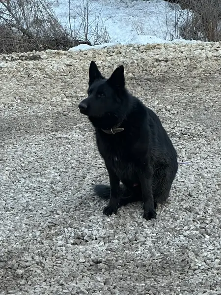 Дворняга, внешне очень похожа на овчарку, девочка, вся черная, на груди маленькое белое пятно, 2,5 года, уши стоят, в правом ухе желтая клипса. На шее был ошейник, кожаный, коричневый (могли снять). Достаточно крупная. Зовут Найда. Глаза коричневые. Предположительно, была увезена с территории, может находиться в любом районе города или за его пределами.