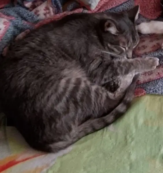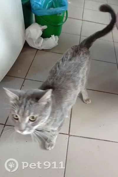 Найден на даче, прибежал на запах еды. Котик чистый, пугливый, но ласковый, когда покормят. Окрас серый с пятнами небольшими и на хвосте кисточка, как будто кота недавно стригли.