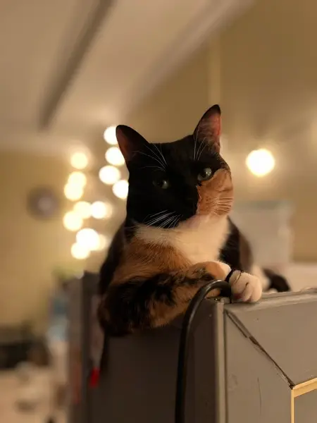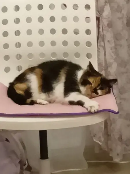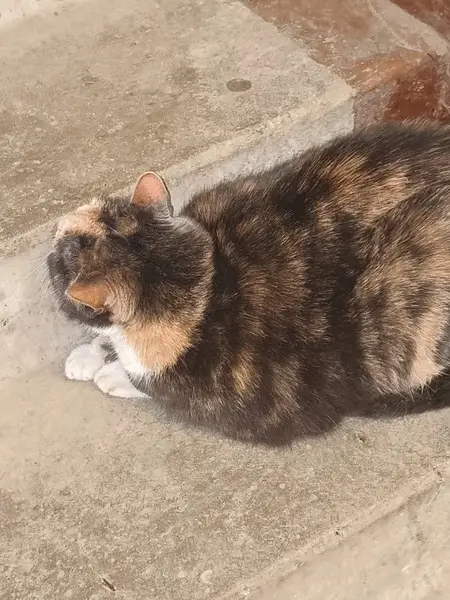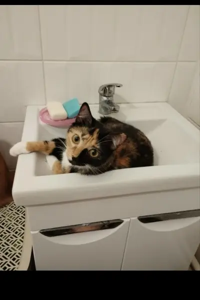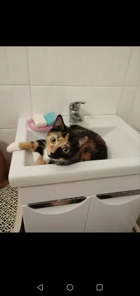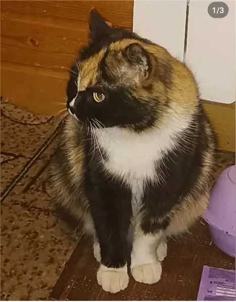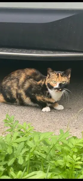 Кошечка время от времени гуляет во дворе последнюю неделю. Раньше её не видела. В основном чёрный окрас, крапенки рыжего и белого. Ходит рядом, но держит дистанцию