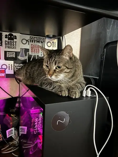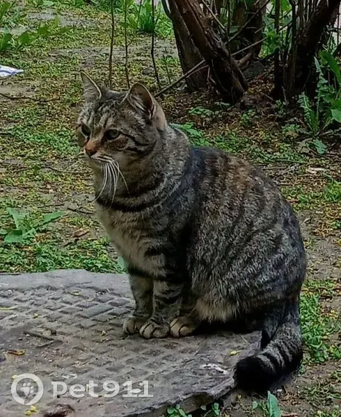 Окрас серый с черными полосами, нос с рыжим оттенком, на кончиках ушей черные кисточки, (возможно девочка), не крупный, густая шерсть, плотный, глаза с голубым, бирюзовым тоном, на руки с мяуканьем просится всегда. Где-то к Новому 2025 году появился во дворе. Хвост короткий, толстый.