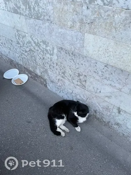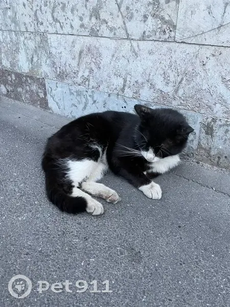 Черный кот с белым носом, грудкой и лапками лежит на наб. Реки Фонтанки, 32 (около дома детского творчества Фонтанка-32). Отказывается от еды и воды. Возможно приучен к домашнему корму.