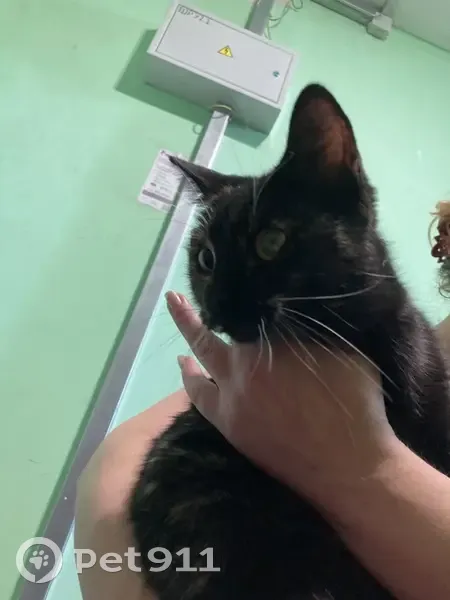 Небольшая пестрая кошка, черепахового окраса, примерно 3-3,5 кг. Спокойная, ласковая. Пока соседи курили в парадной, кошка сбежала с этажа выше и метнулась к ним в квартиру.