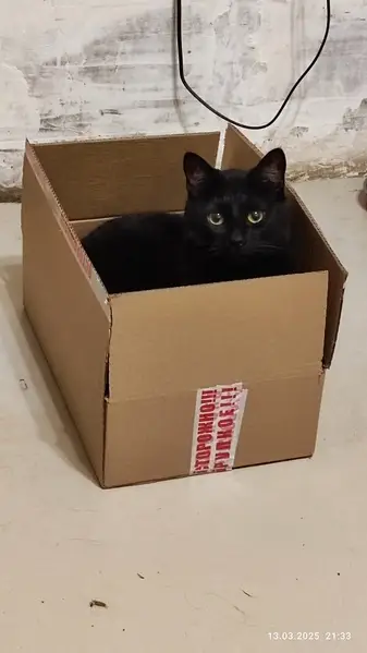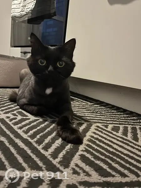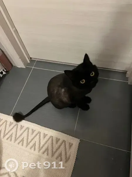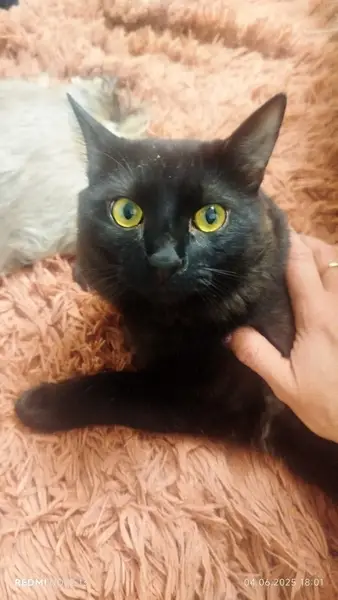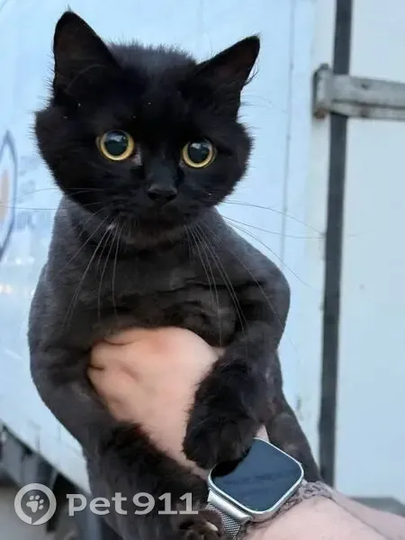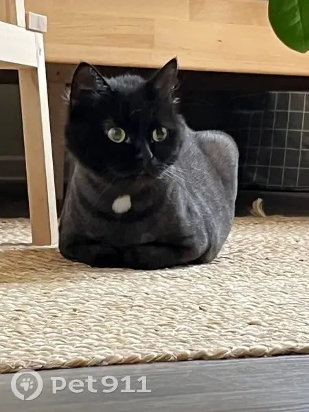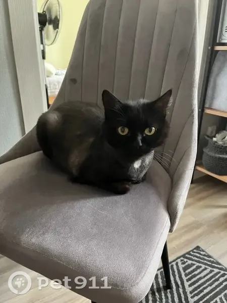 Найдена чёрная кошка с белым пятном на груди, после груминга, подстрижена подо льва. Пряталась под газелью у заправки, кошке примерно 3 года, не кастрирована, здорова.