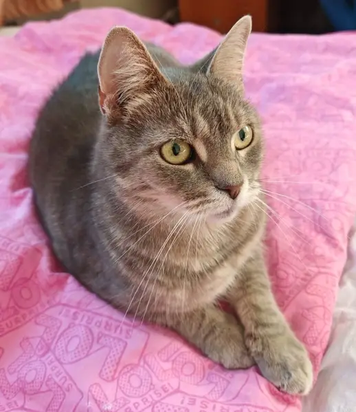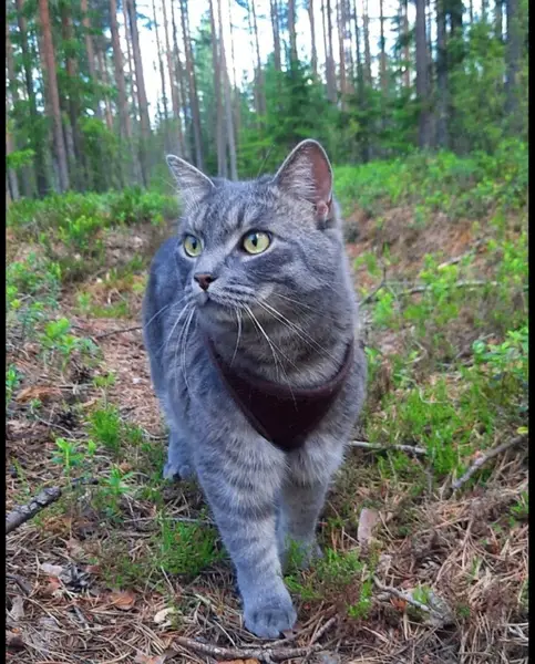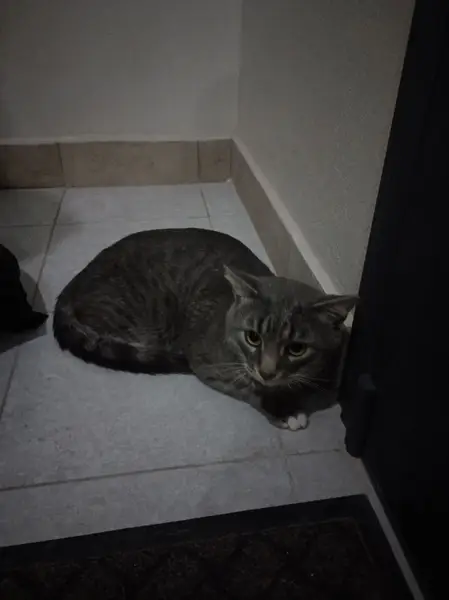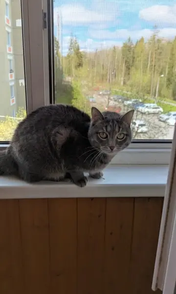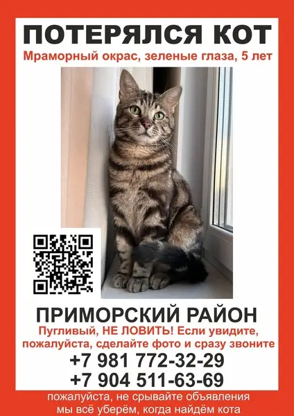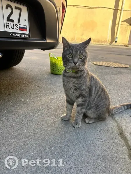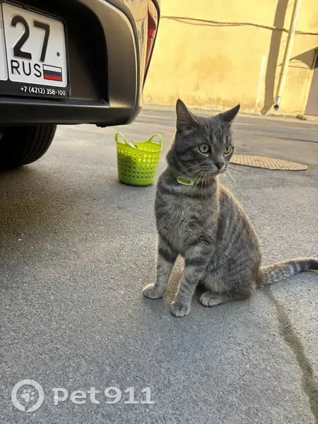 Кот не кастрирован. Окрас- серо полосатый. Крупный, но худой. На шее ярко зеленый ошейник. На передней левой лапе рана. Подходит, можно погладить. Видимо кот домашний, общительный.