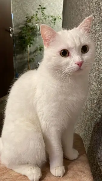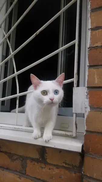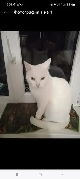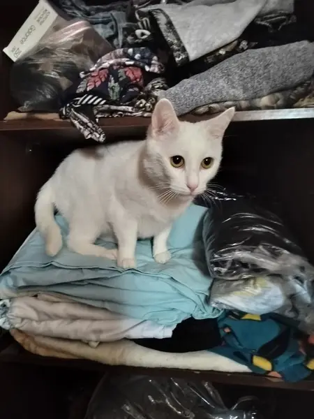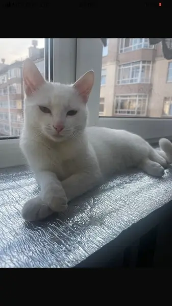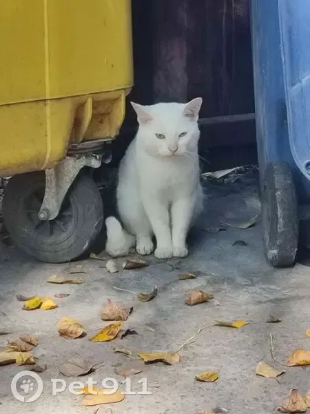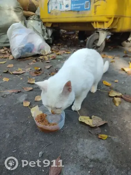 Белый некрупный котик, разные глаза: голубой и зеленый, возможно, глухой. Очень громкий голос. Ласковый, позволяет взять себя на руки. Жутко голодный. Появился у нас во дворе вчера 10.09.