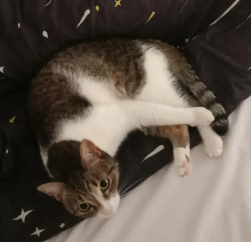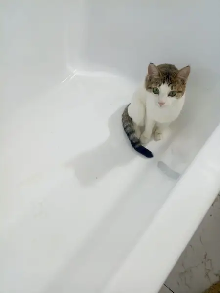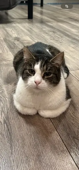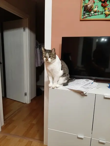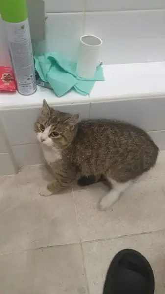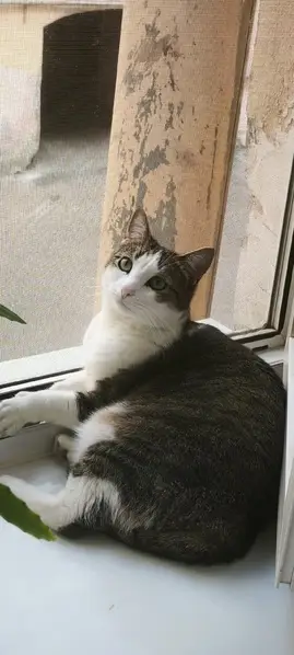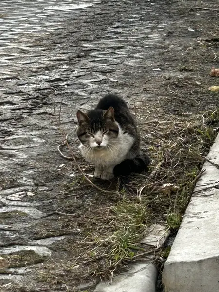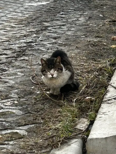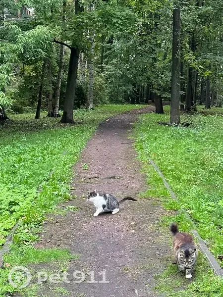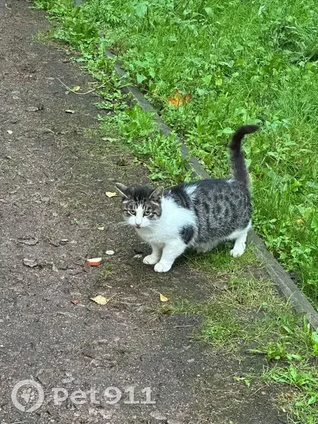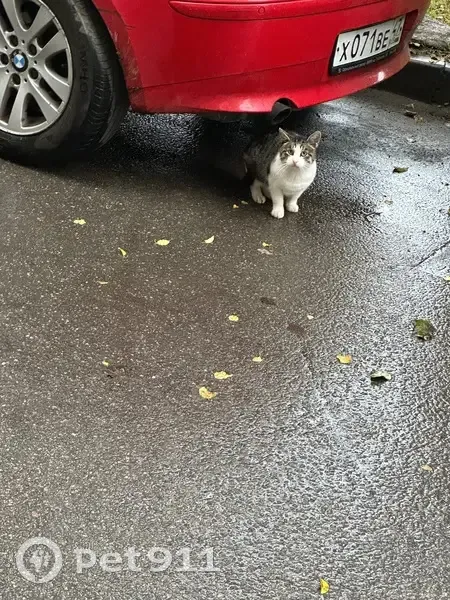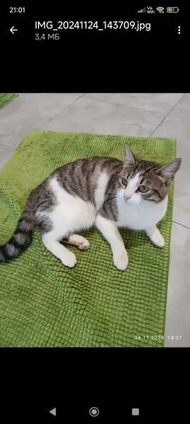 Белый с полосатым, напуганный вид, с другими котами держит дистанцию, раньше не видела этого котика. Выглядит чисто. Забрать не смогла, нет возможности и не подпускает к себе