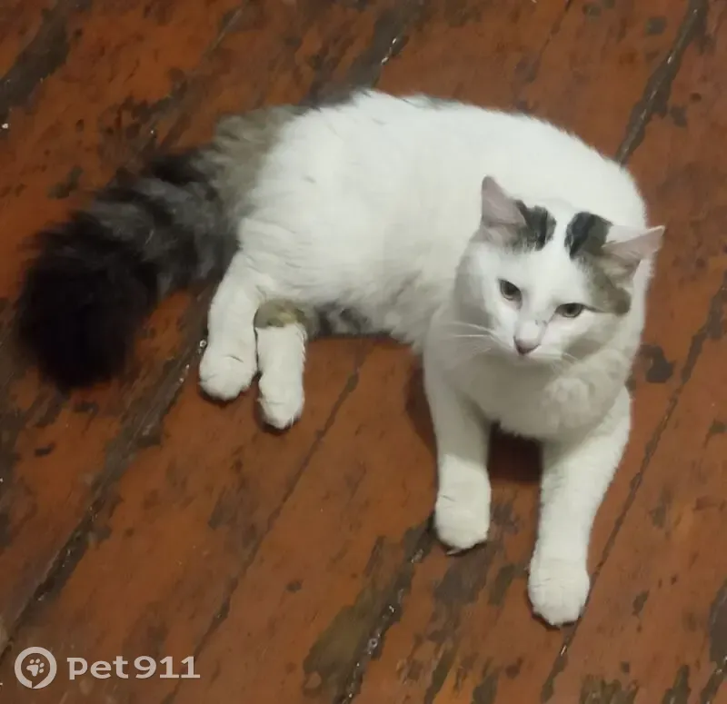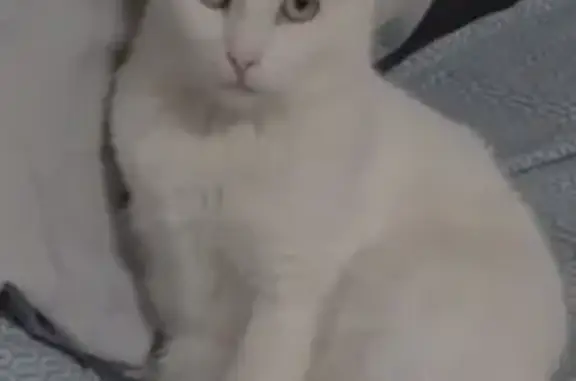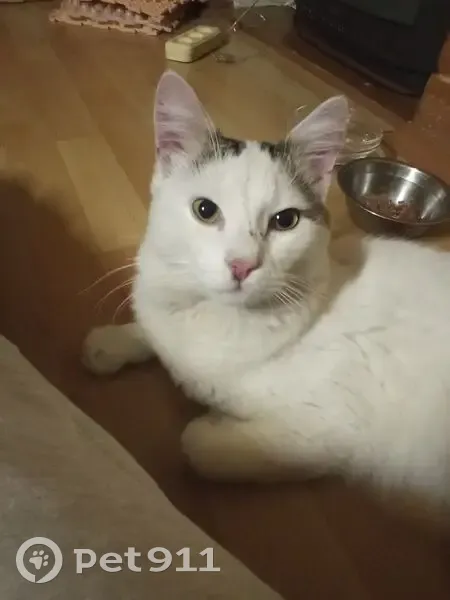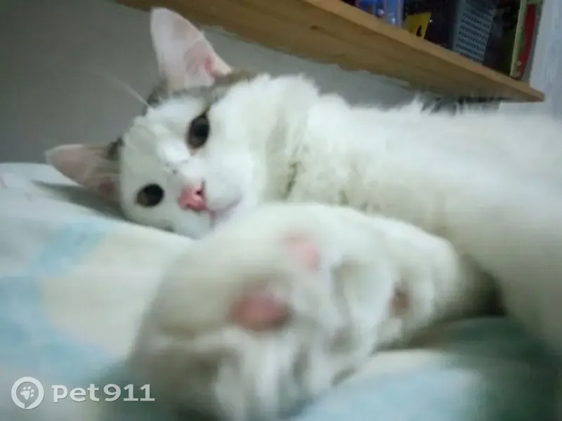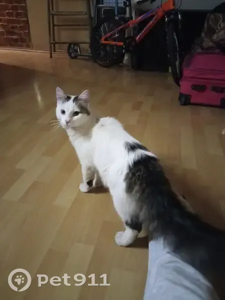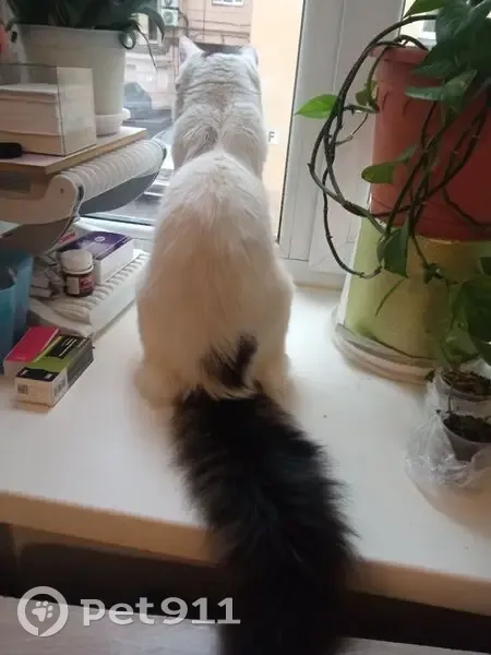 Кастрированный кот. Белый, с черными пятнами. Пушистый хвост, на спинке пятно похожее на сердечко. Желтые глаза. Очень ласковый. Выбежал ко мне с газона, и стал ластится, давал себя погладить, побежал дальше по улице, приставая к каждому проходящему мимо человеку, будто прося помощи. Забрала к себе на передержку, котик даже сам охотно за мной пошел, отзываясь на кскскс.
