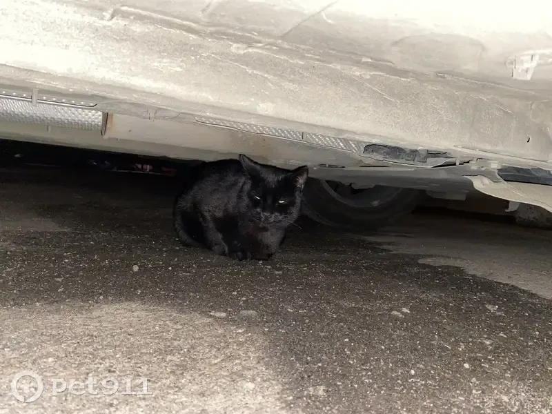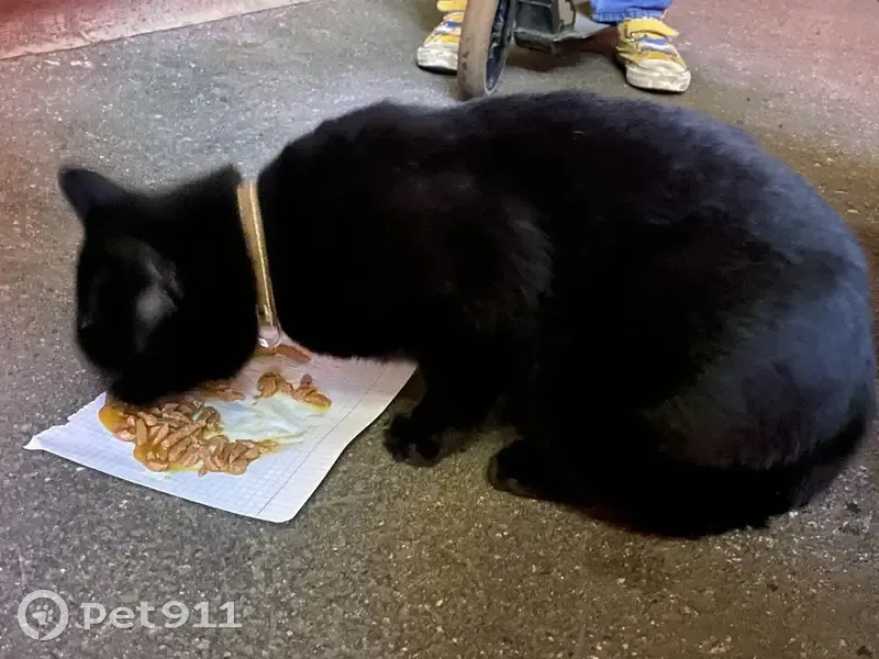 полностью черный (точно не рассмотрели котик или кошка) был очень напуган, видно что домашний накормили. Желтый ошейник с полосочкой, с круглой подвеской (надписей нет)