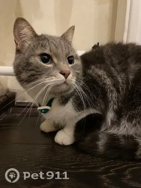 Серо-полосатая спинка, белая грудка и лапки, розовые подушечки, изумрудно-бирюзовые глазки. На кошечке ошейник резиновый «от блох и клещей» темно-зеленого цвета. Кошечка очень ласковая, ручная. Сама пошла на руки. Мяукает, словно пищит. Переходила поздно ночью около 12 часов улицу Тобольскую в районе училища 25.09.25