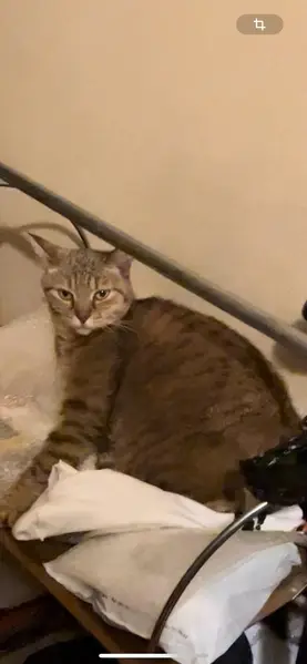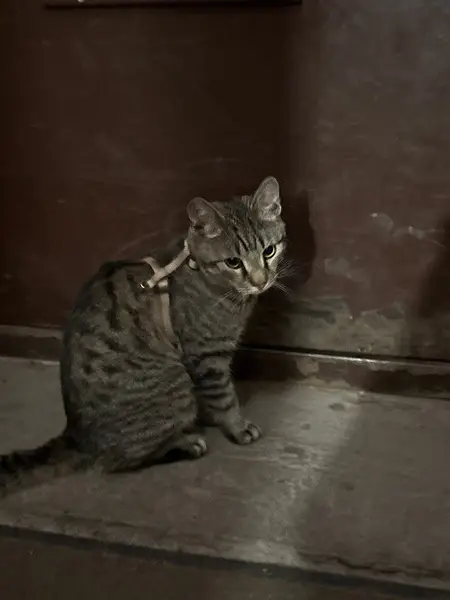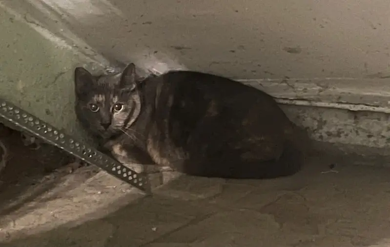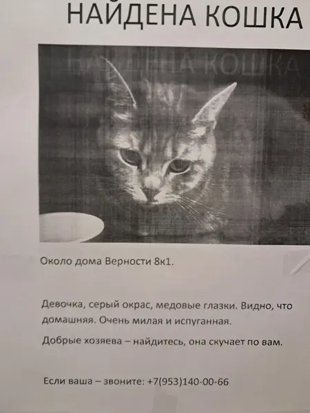 Серая кошка с черепахыми разводами по спинке, по позвоночнику более чёрная, ласковая. Знает туалет, ест сухой и мягкий корм, чувствуется, что кошка домашняя.