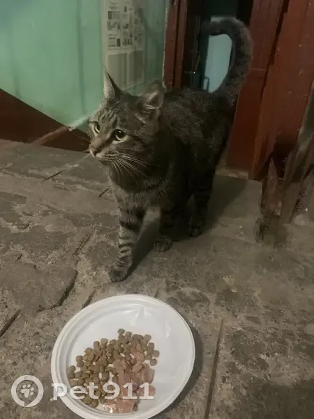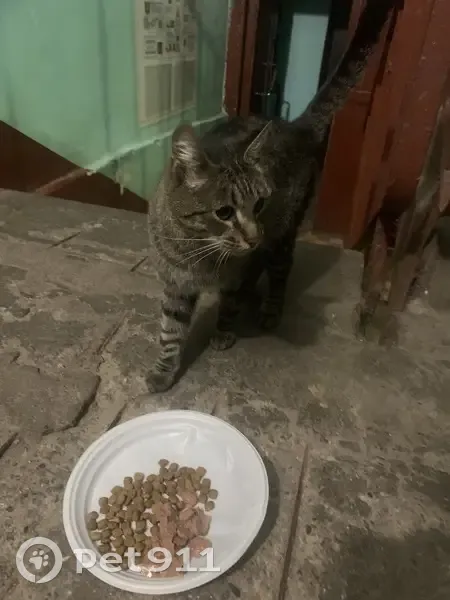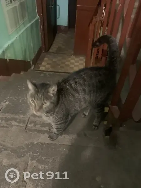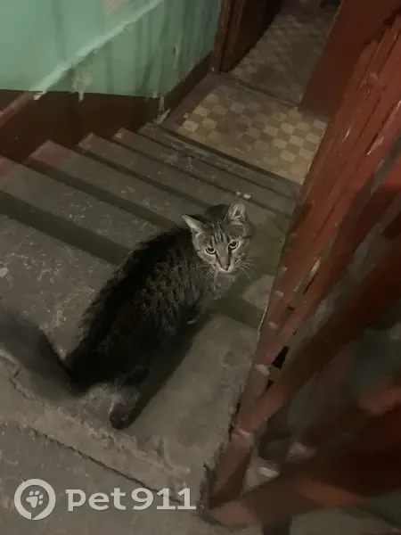 Нашлась кошка, сидела в подъезде, очень ласковая, коммуникабельная, скорее всего домашняя, хотим найти хозяев, кошечка одна, вынесли покушать, но есть не стала