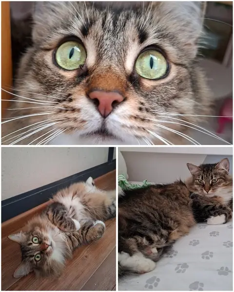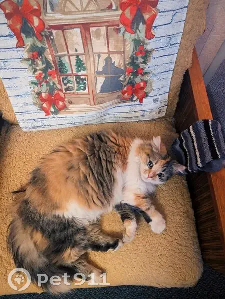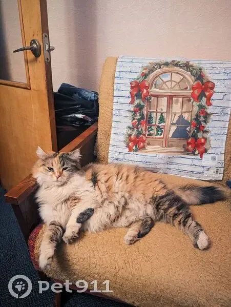 Кошка убегала от кота с соседнего дома и забежала за соседями в подъезд. Ласковая, людей не боится, возможно гуляет, чистая и пушистая с испуганным взглядом. Окрас трехцветный (рыжий, черный, белый)
