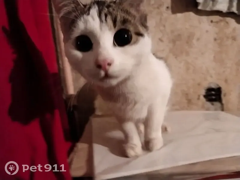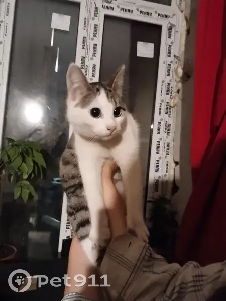 Кошка ручная, ласковая, чистая, очевидно домашняя. Окрас белый с полосатым, на голове " шапочка". Возраст 4-6 мес. Нашлась во дворе дома, бегала, искала, громко мяукала, была напугана.