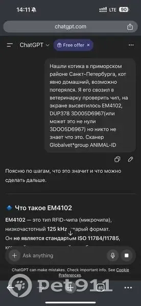 Нашли котика в приморском районе Санкт-Петербурга на богатырском проспекте. Кот явно домашний, очень ласковый просто чудо. Живет в автоцентре с декабря месяца. Я его свозил в ветеринарку проверить чип, на экране высветилось EM4102, DUP378 3D005D6967(или может это не нули 3DOO5D6967) но никто не знает что это. Сканер Globalvet*group ANIMAL-ID Чип не стандартный, старого образца и современные сканеры не могут его прочитать корректно и найти информацию о хозяине. Ищу старых или новых хозяев.